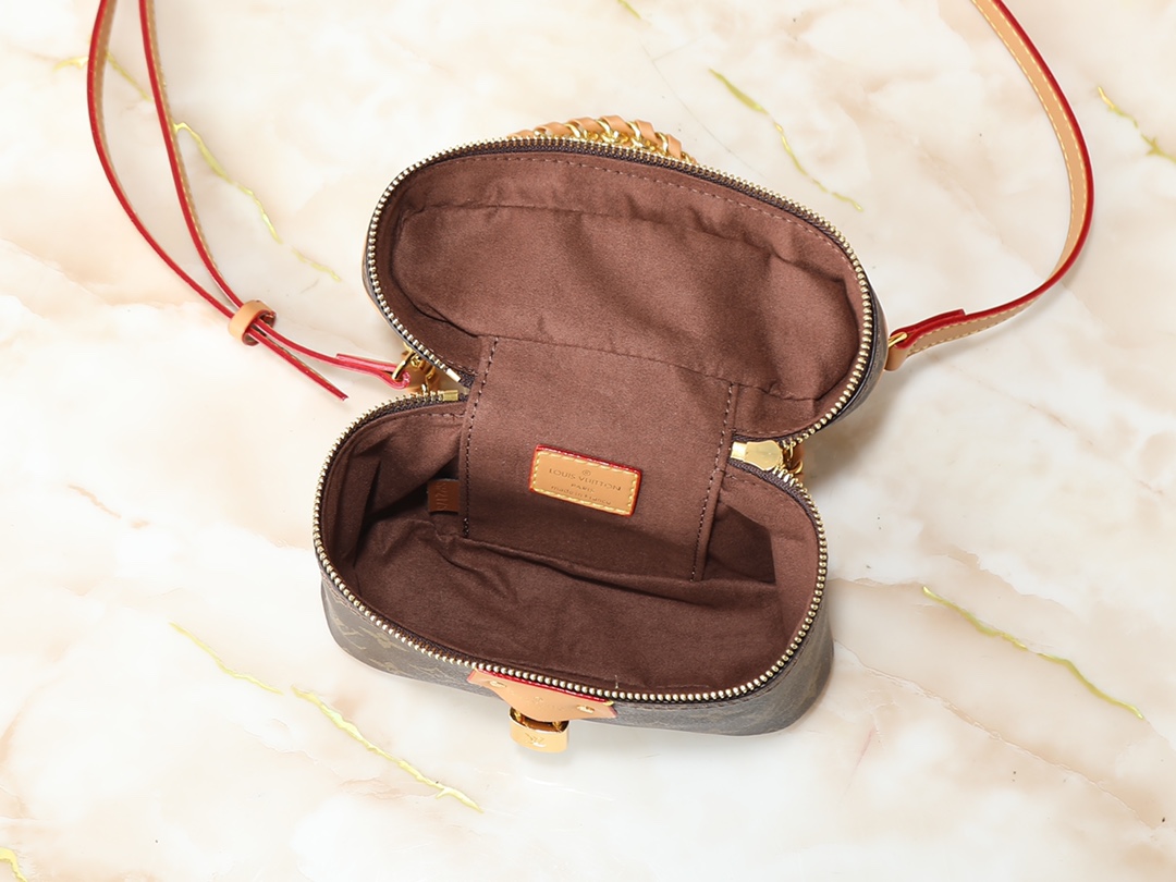Version M47125 This Vanity Chain Pouch handbag draws inspiration from the classic vanity case, interpreting the spirit of travel in Monogram canvas. The top handle and detachable woven chain incorporate leather elements, complementing the bag’s clean lines. The LV-engraved padlock and leather key pouch continue the iconic details. Dimensions: .0 x .5 x 6.5 cm (Length x Height x Width)