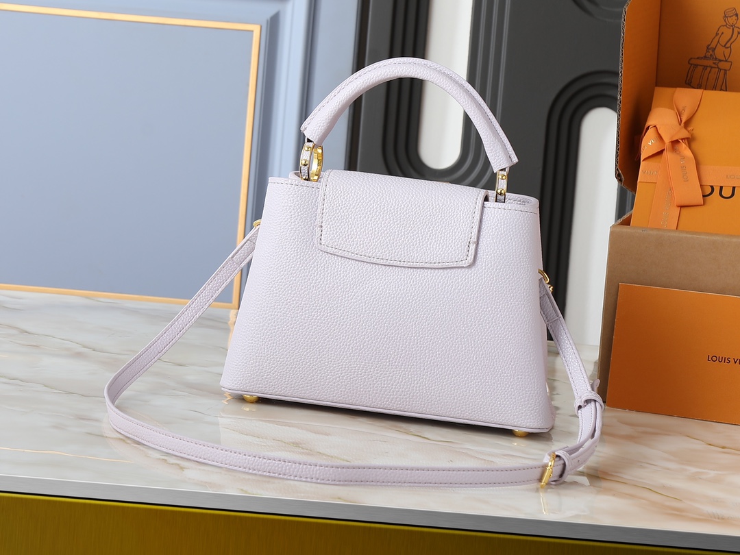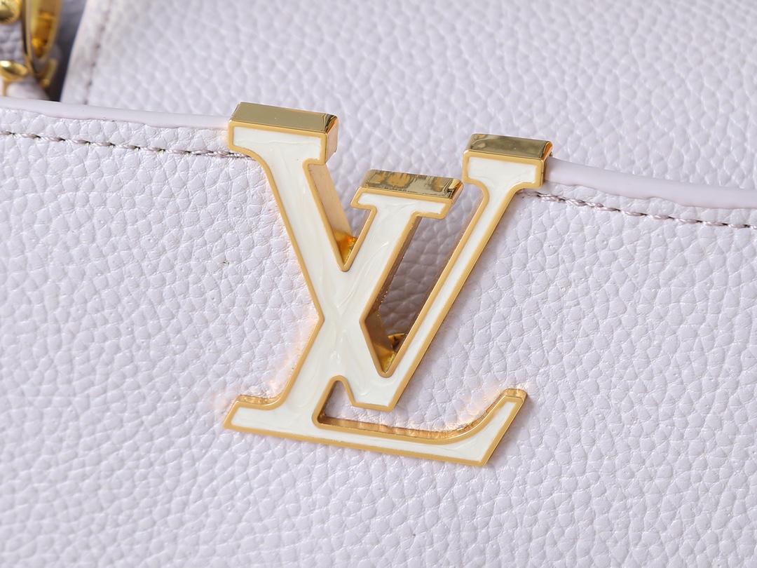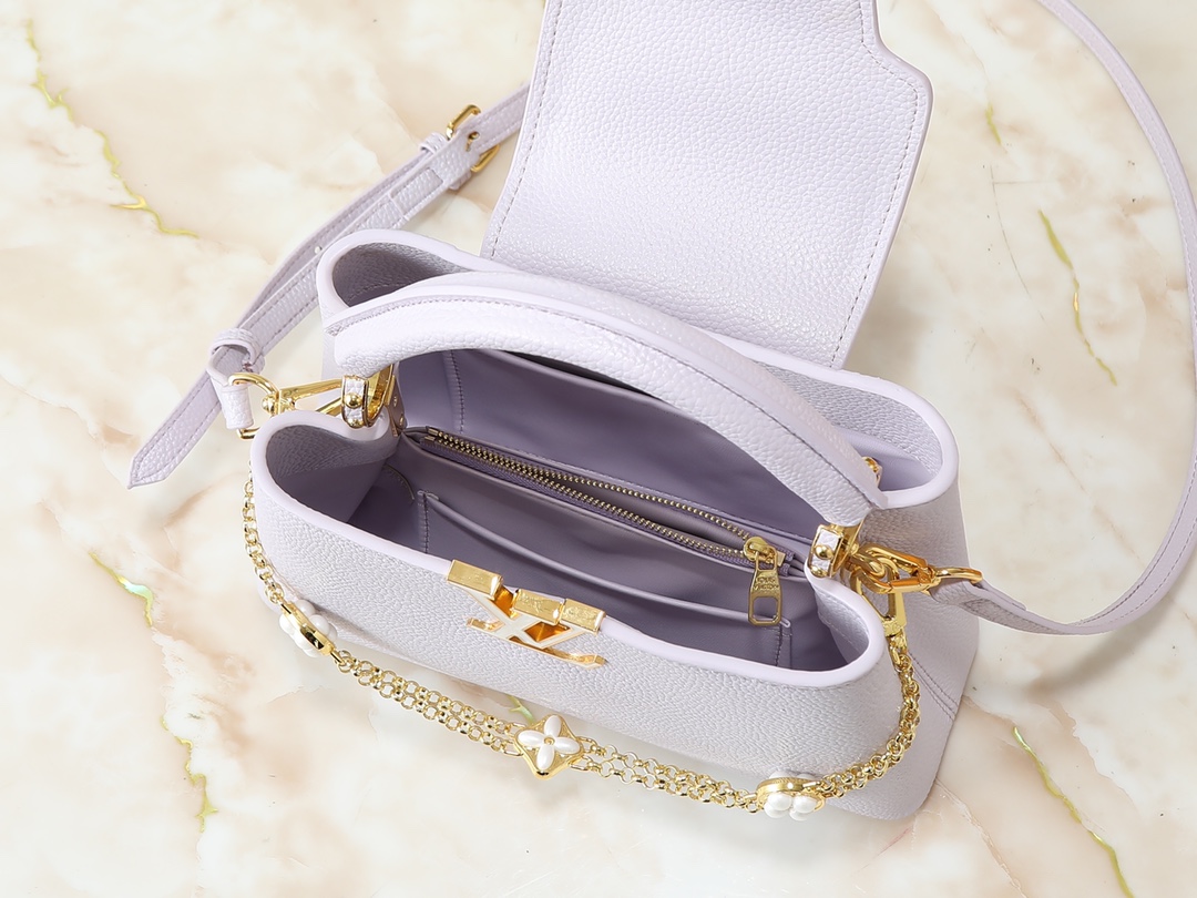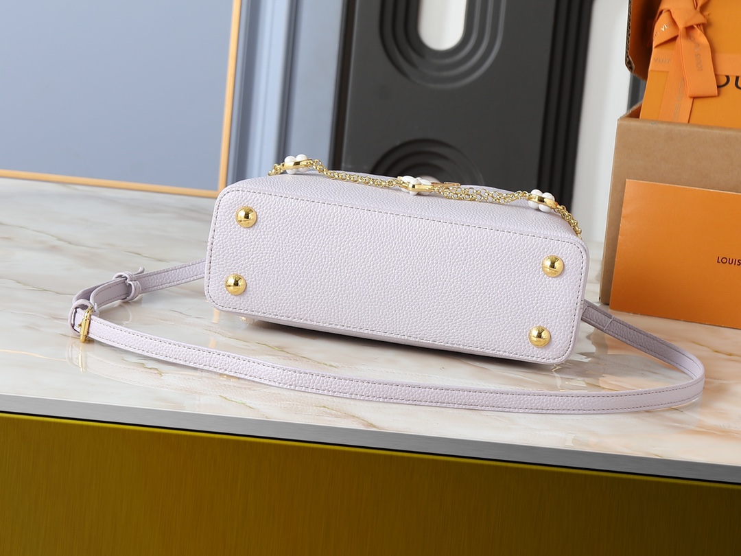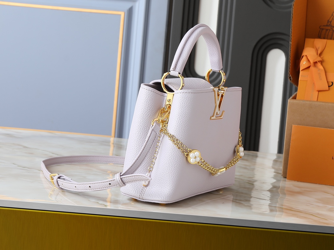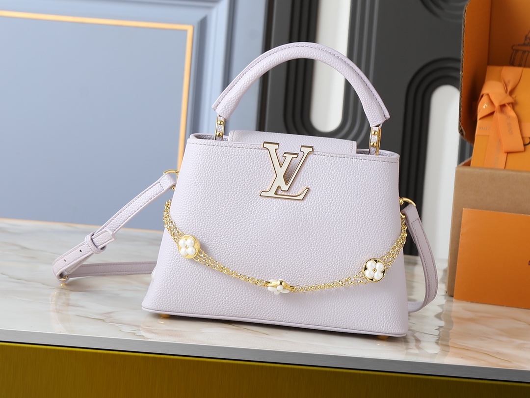 , version M25862 M25461 M25476 M25903 M15117. This Capucines BB handbag is crafted from Taurillon calfskin in a classic hue, inspired by a classic seashell necklace from the Daydream collection. A Baroque-style chain adorned with Monogram flowers, LV lettering, and delicate beads add a touch of glamour. Dimensions: x x 9 (cm) (Length x Height x Width)