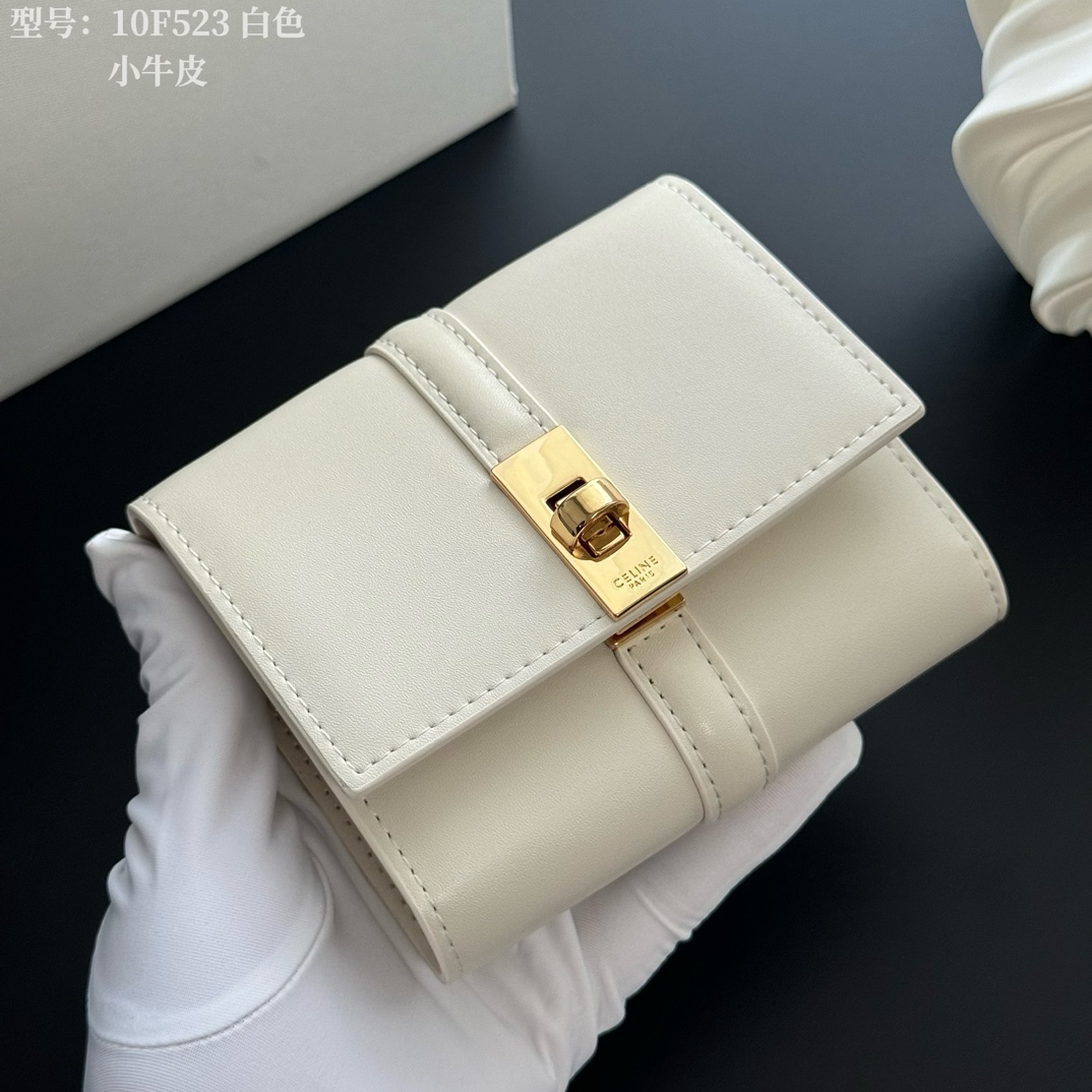 Cowhide Leather Lining: Cowhide Leather/Fabric Gold Finish Rotary Lock Closure 1 Folding Coin Pocket with Snap Button 5 Card Slots 1 Bill Pocket 2 Flat Pockets. Size: 10.5×8.5