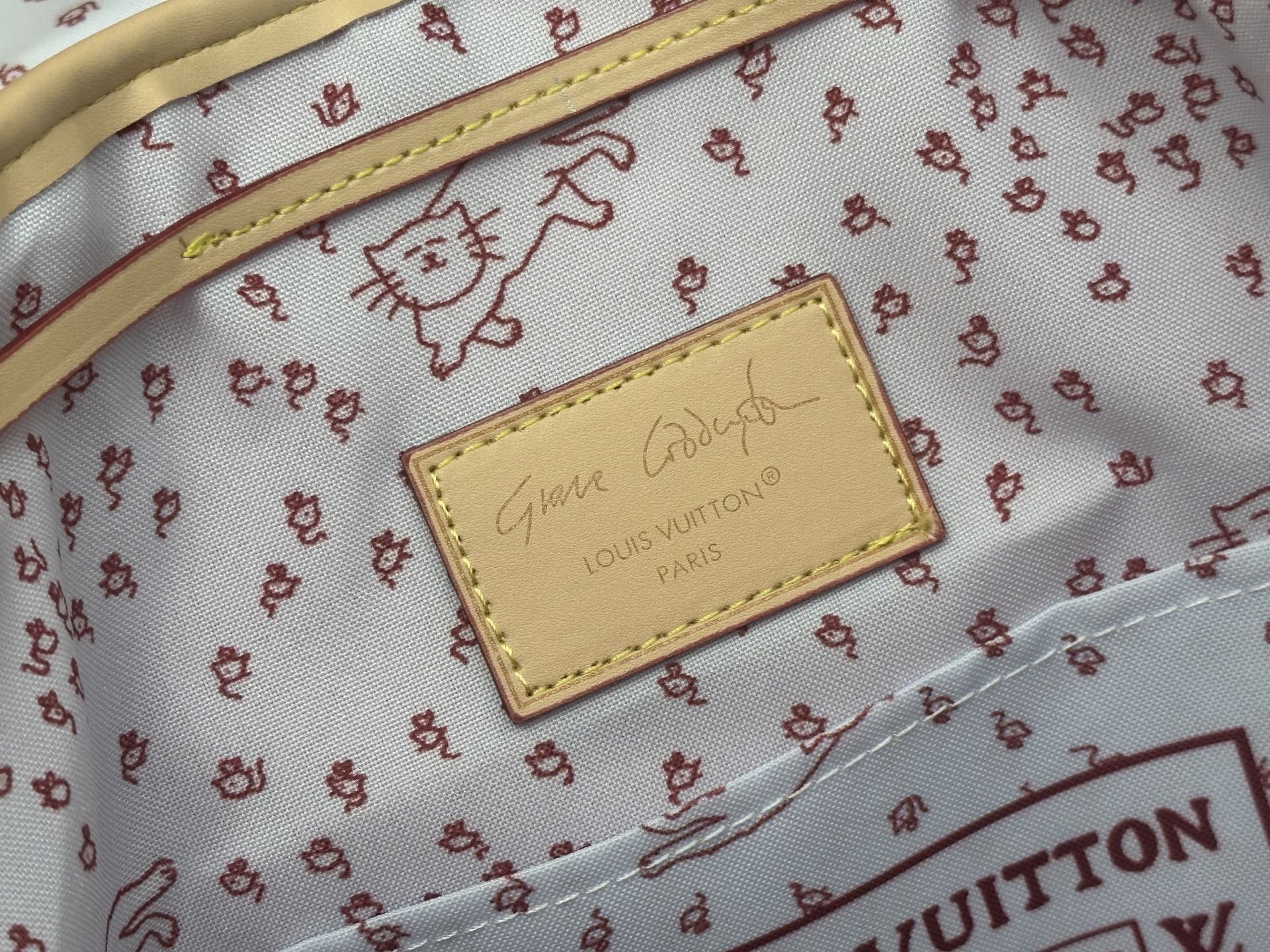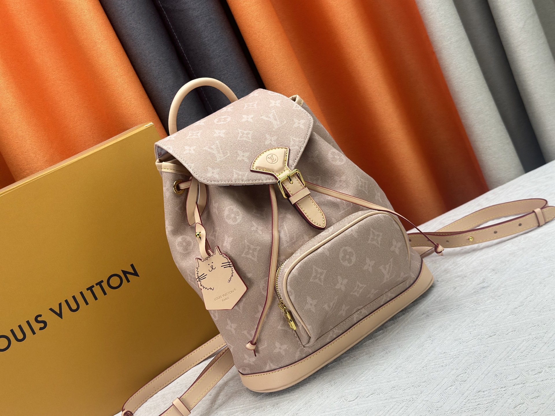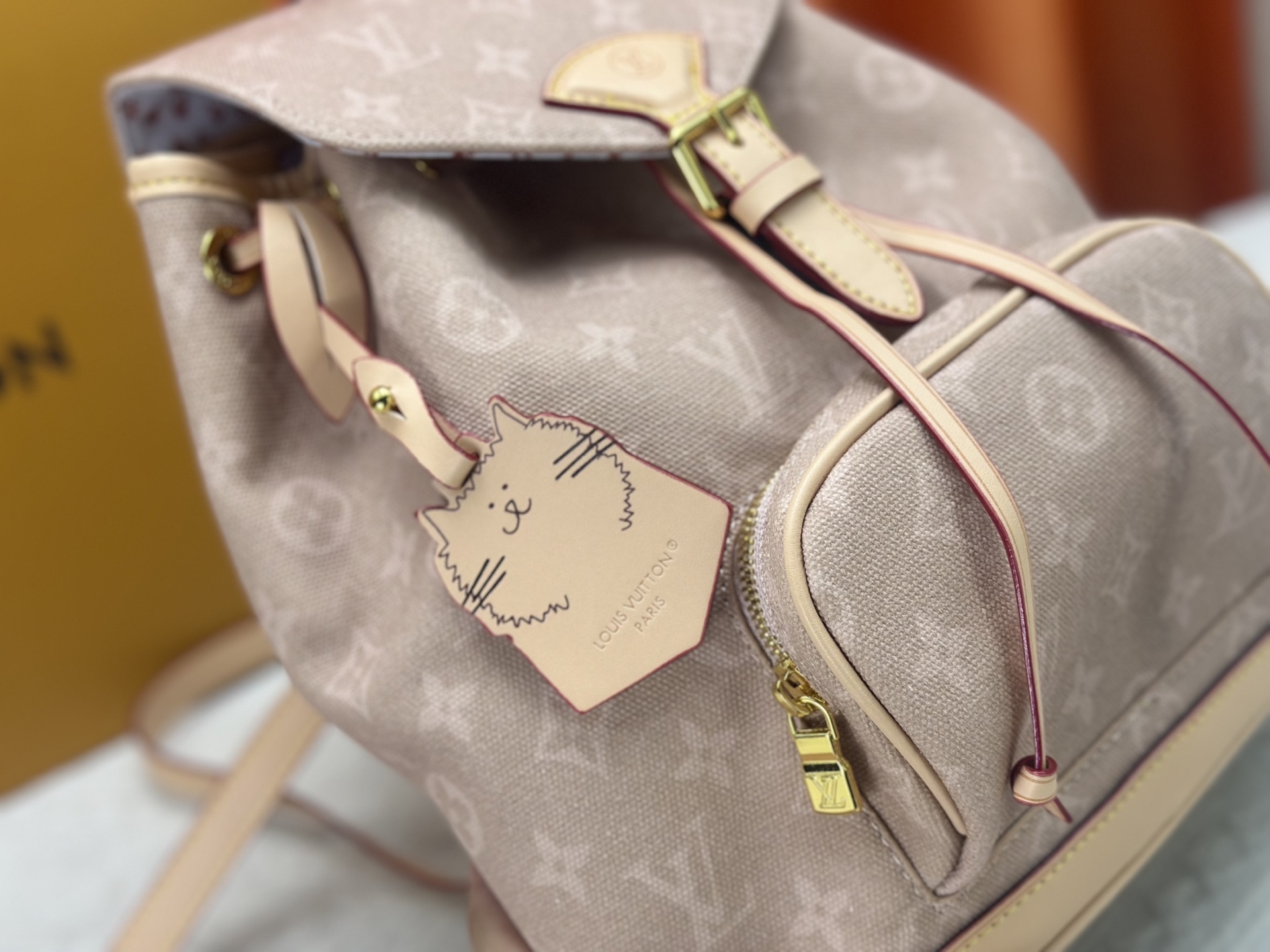 M15135 This Montsouris small backpack is from the LV Travels With collection, featuring the whimsical Meowgram pattern designed by fashion icon and artist Grace Coddington, showcasing her love for cats. The canvas body includes a detachable cat-shaped key pouch, ample space for everyday essentials, and a short wallet is also included. Dimensions: x x cm (H x W x Length)
