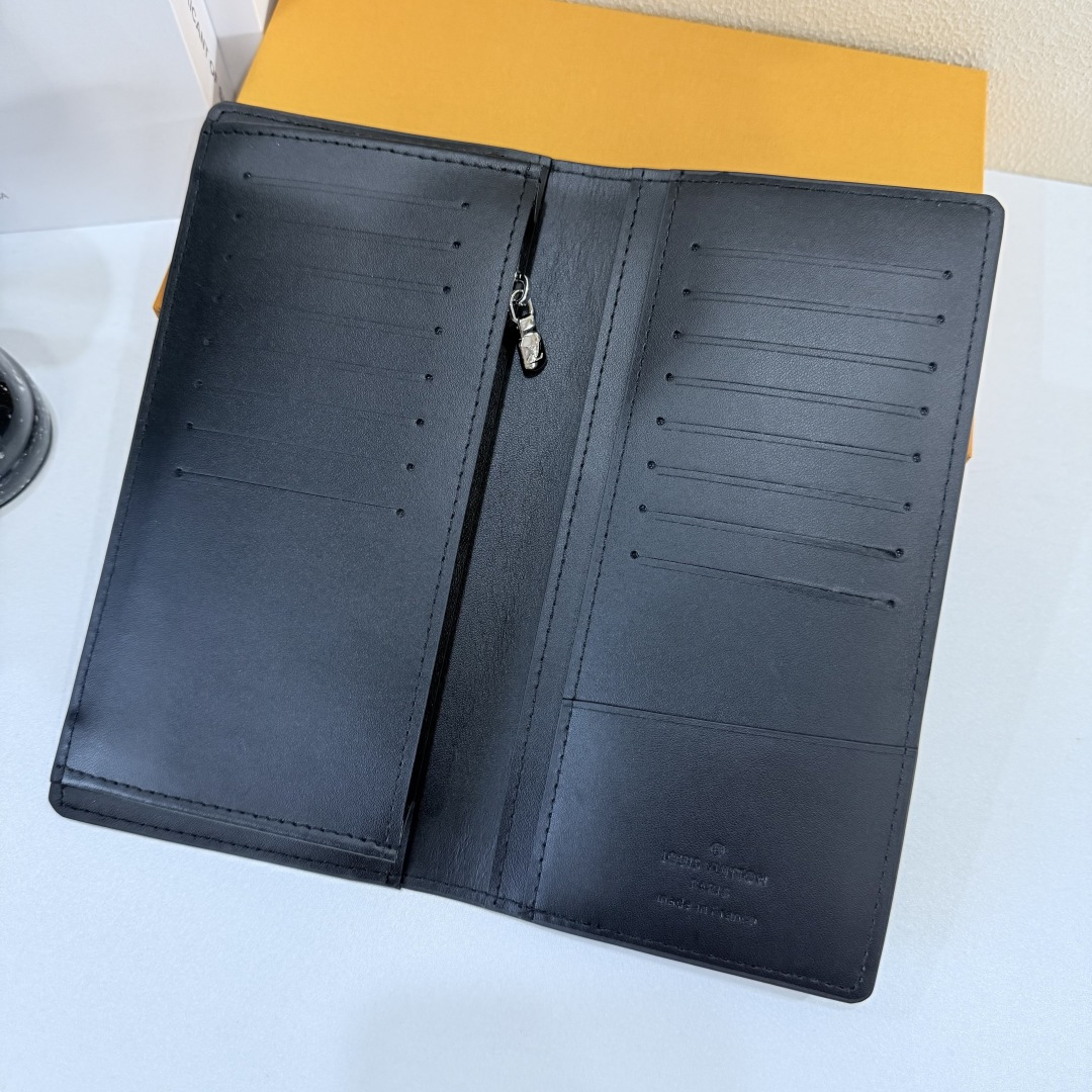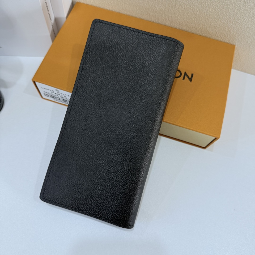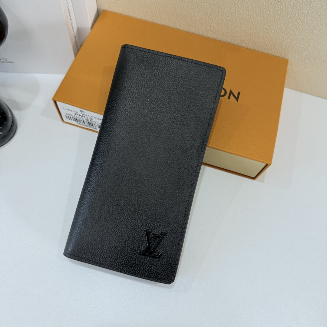 【Actual Photos, Own Background】M69980 Black Metal Lettering! Aerogram Brazza Wallet. Featuring the delicate texture of heavy-grain calfskin, subtly branded with metal LV lettering. Compartments and card slots hold bills, documents, and coins, making it a perfect match for LV Aerogram handbags. x x 2 cm 62665