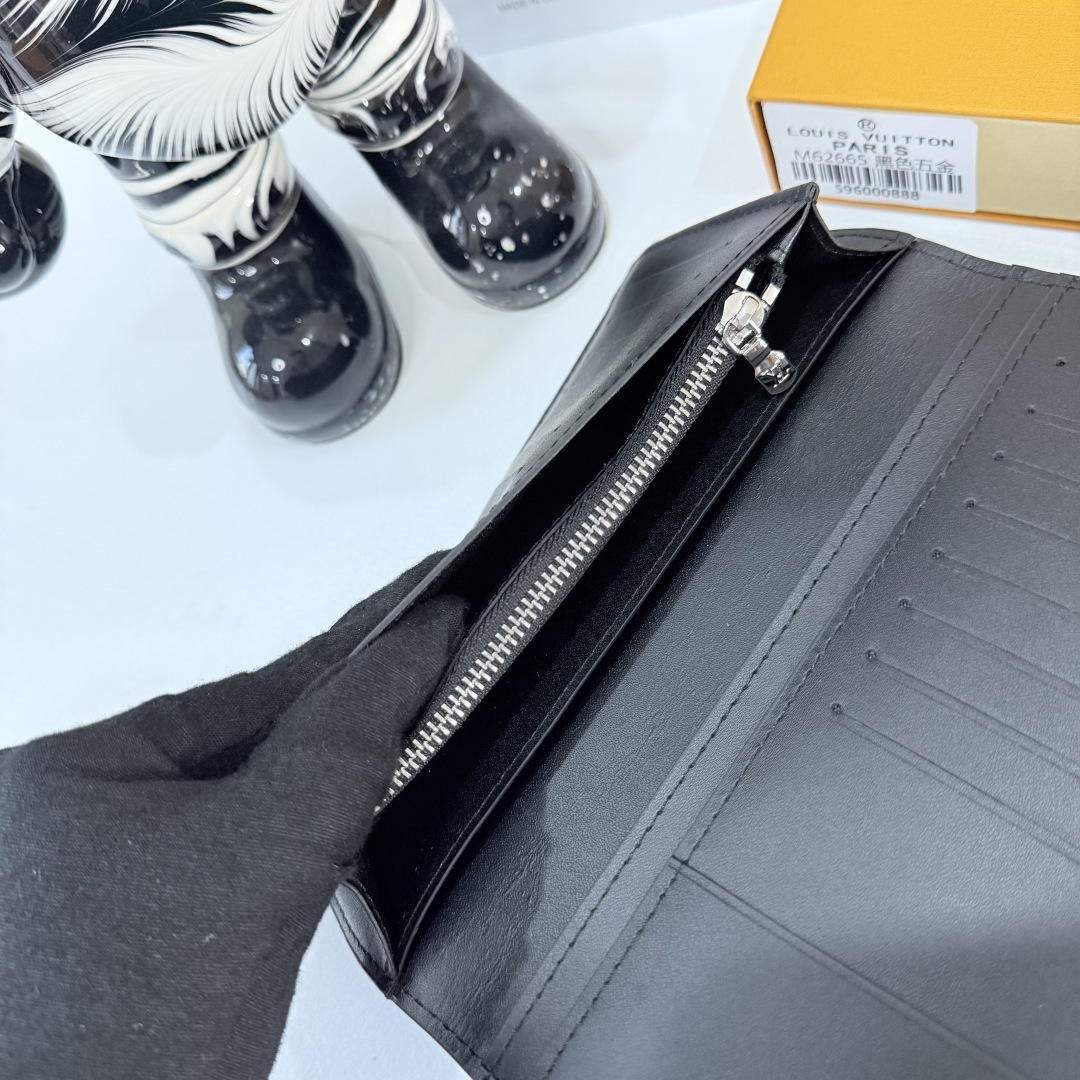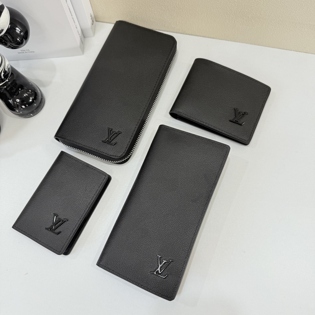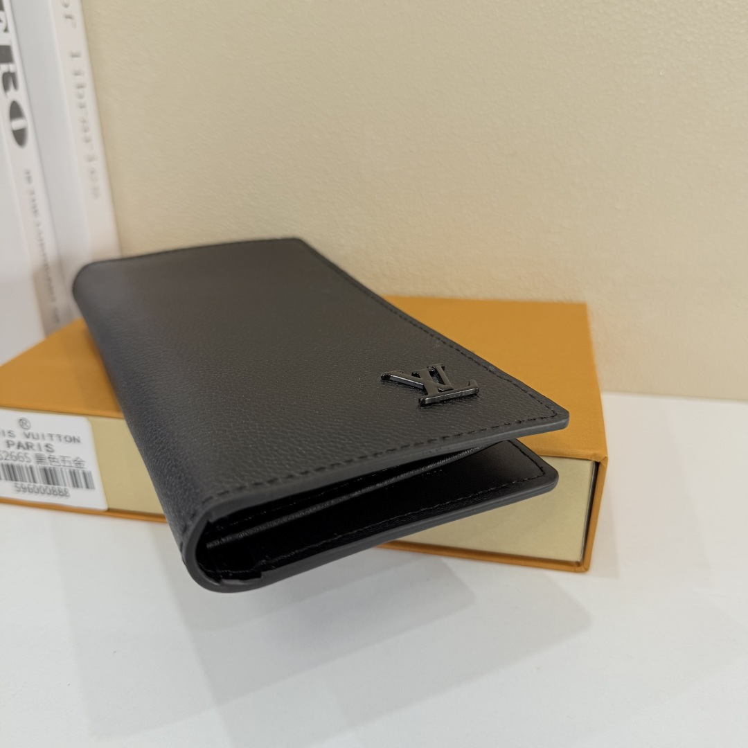 【Actual Photos, Own Background】M69980 Black Metal Lettering! Aerogram Brazza Wallet. Featuring the delicate texture of heavy-grain calfskin, subtly branded with metal LV lettering. Compartments and card slots hold bills, documents, and coins, making it a perfect match for LV Aerogram handbags. x x 2 cm 62665
