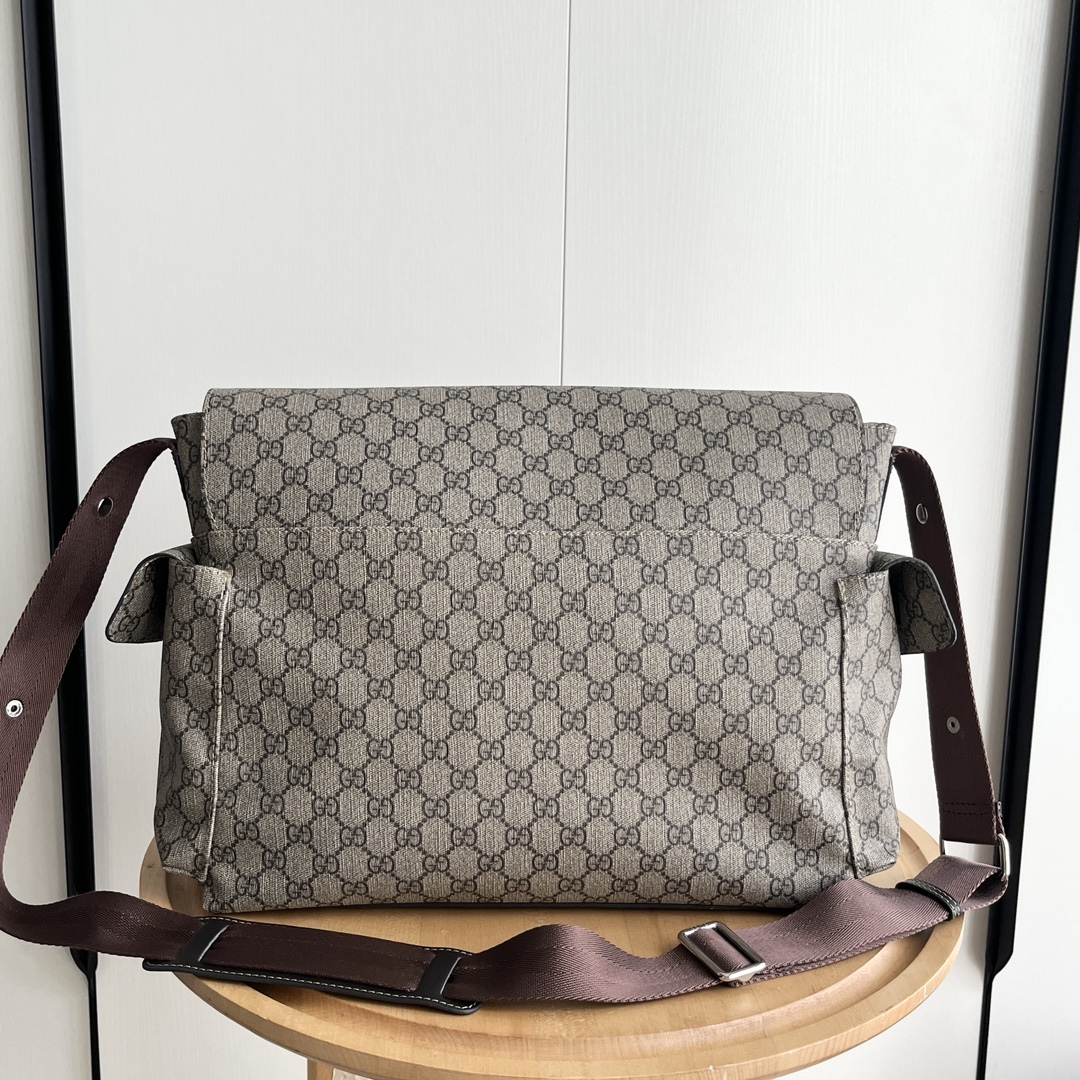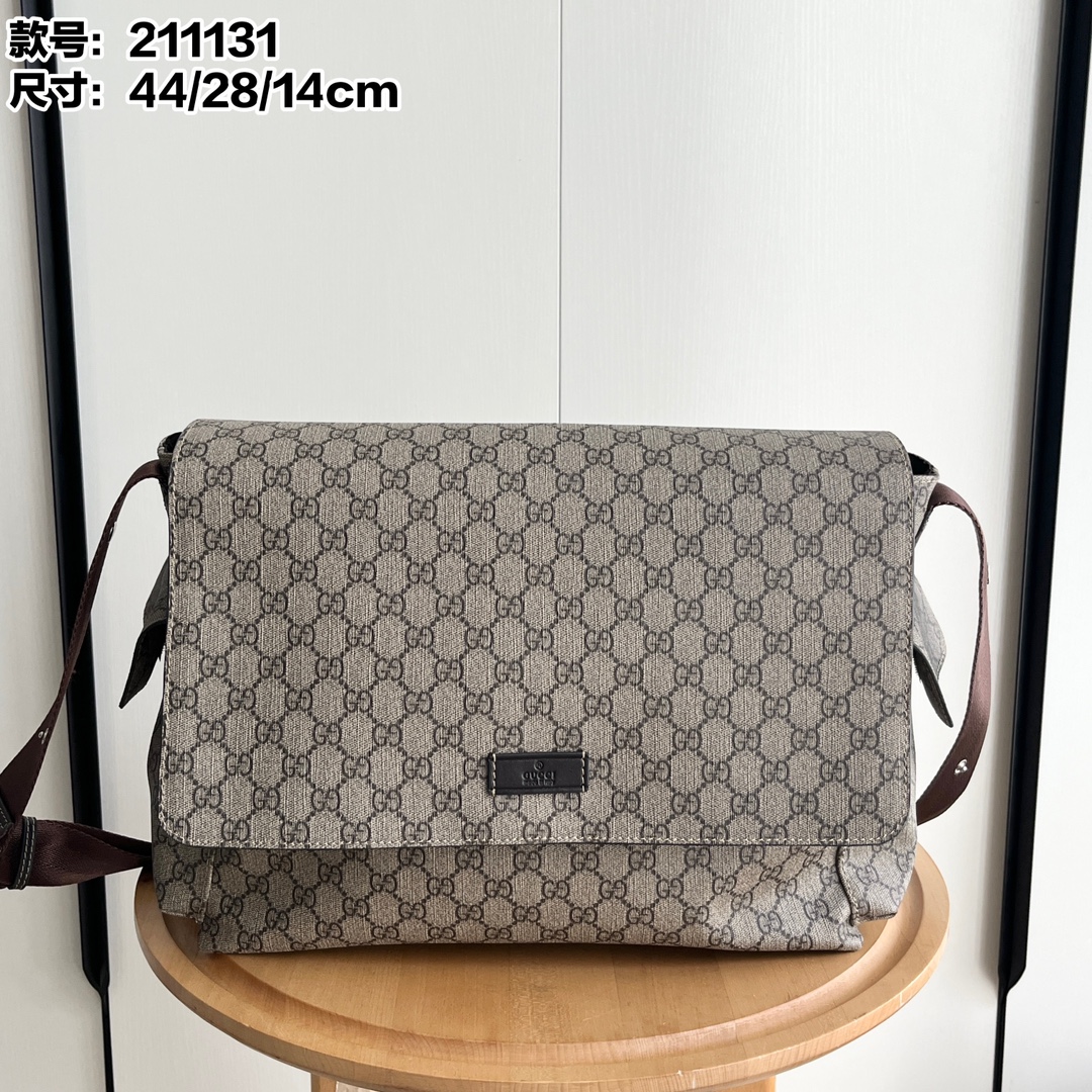 Model: 211131 (Brown) Size: × ×14cm This popular GUCCI diaper bag has a large capacity and two side pockets for water bottles. The large flap design is very convenient, and it comes with a folding pad. Unisex! Made with imported fabric and brown leather, the shoulder strap is adjustable.