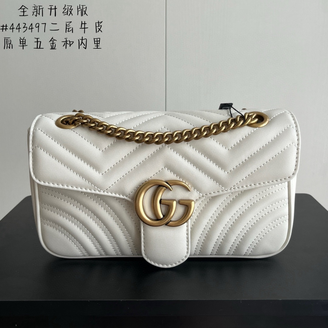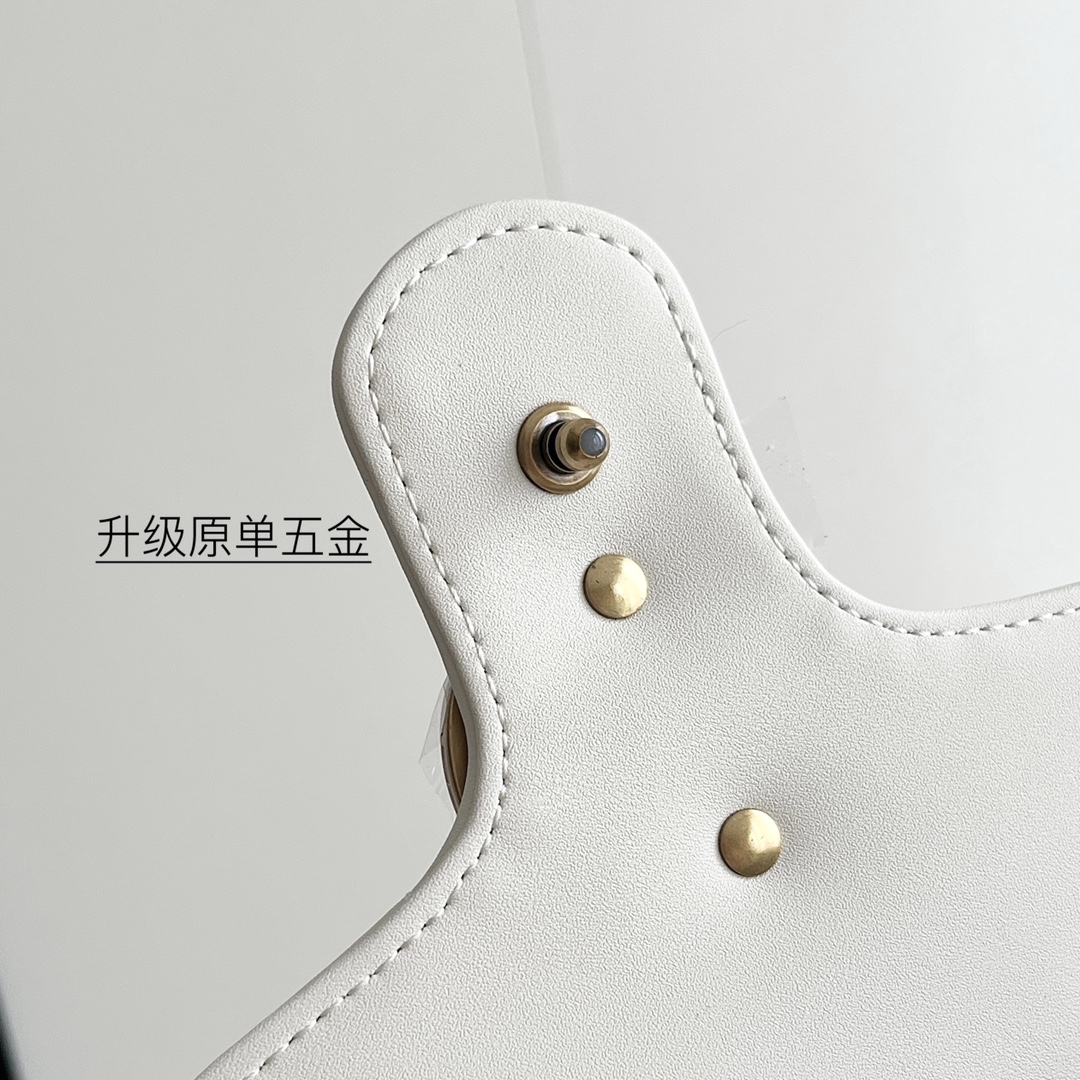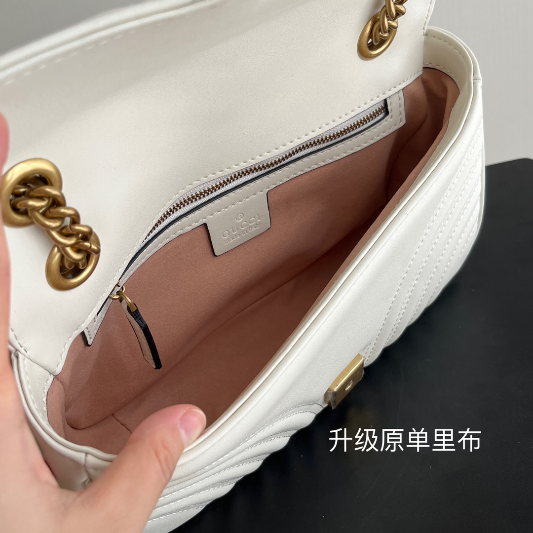 Style No.: 443497 White Size: -7-15cm GG Marmont Medium Classic design unchanged, hardware and lining, more for the same price Huge capacity: fits a power bank, makeup supplies, and a phone with room to spare Super versatile, two ways to wear it: crossbody for a casual look, or two chains folded over the shoulder for a more sophisticated feel ‍⚖️