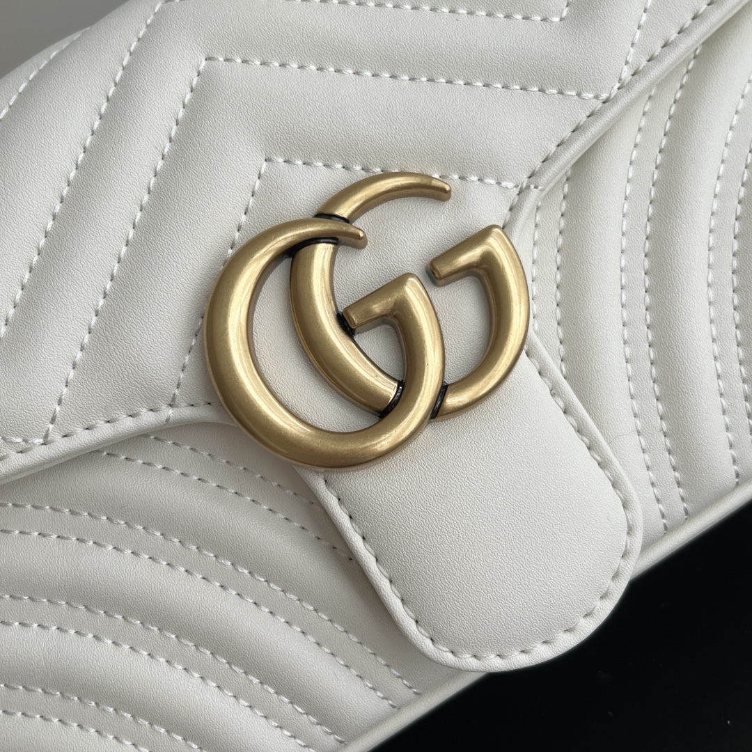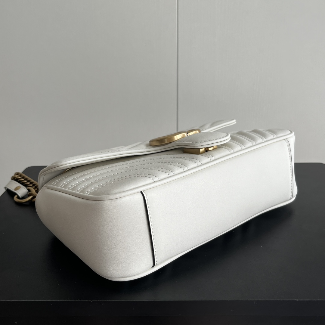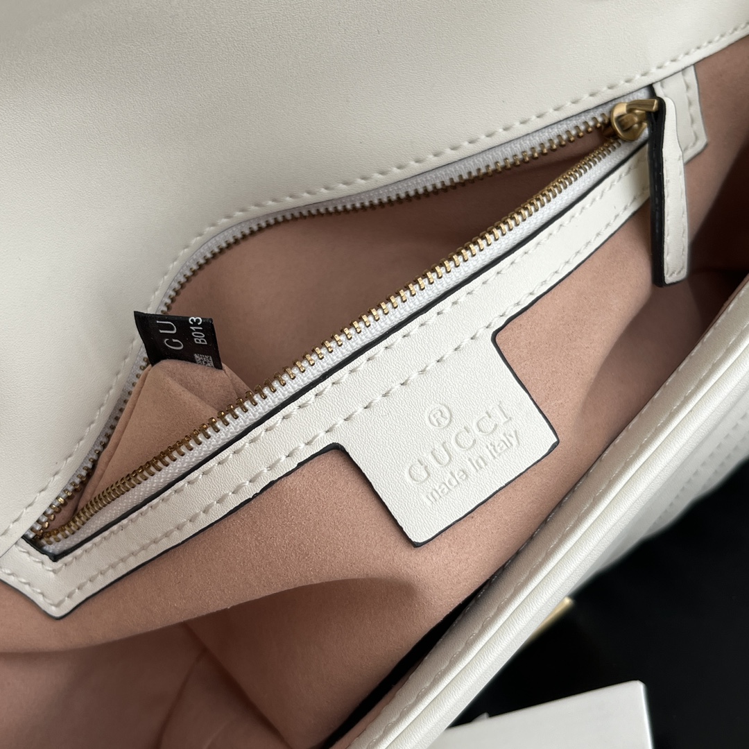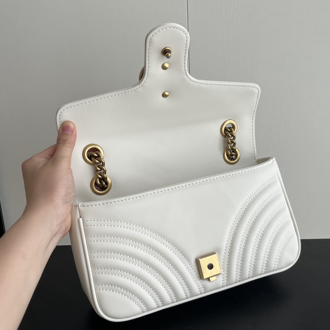 Style No.: 443497 White Size: -7-15cm GG Marmont Medium Classic design unchanged, hardware and lining, more for the same price Huge capacity: fits a power bank, makeup supplies, and a phone with room to spare Super versatile, two ways to wear it: crossbody for a casual look, or two chains folded over the shoulder for a more sophisticated feel ‍⚖️